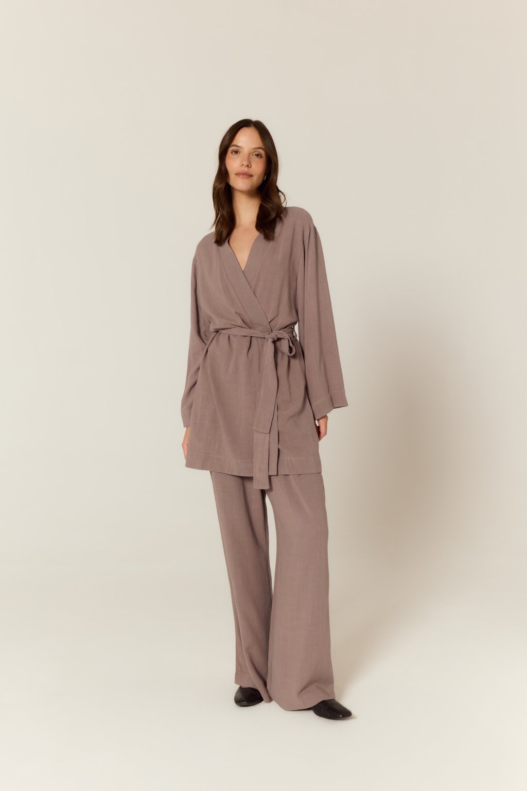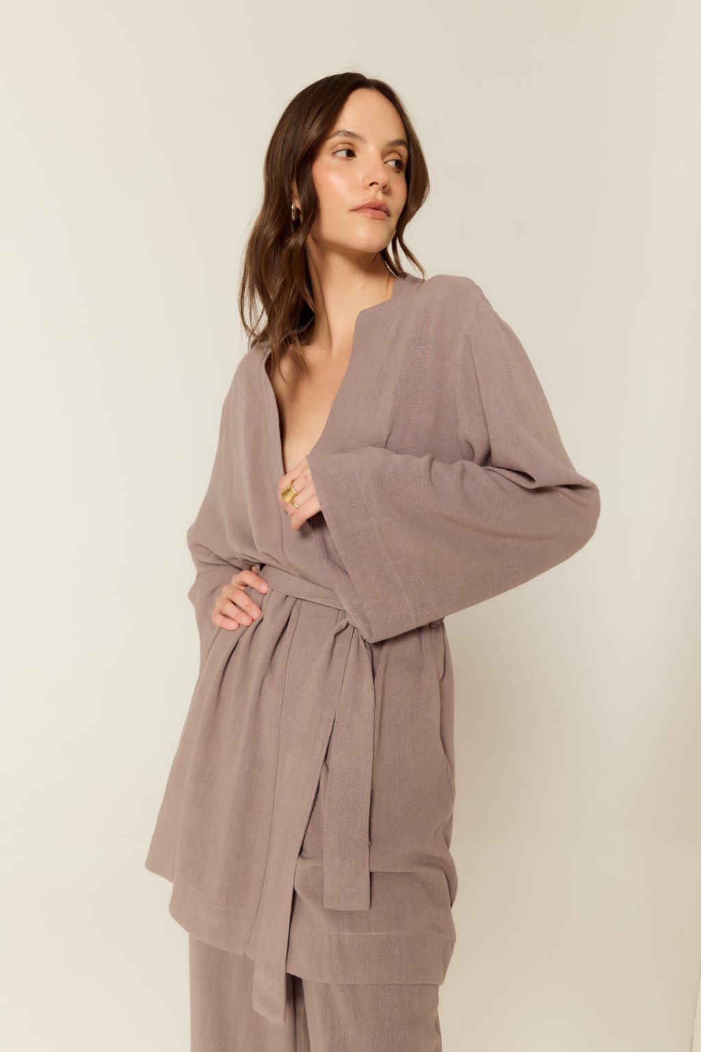 Przedłużoną narzutkę kimono możesz nosić jako sukienkę, luźno zarzuconą na bieliznę lub jako lekki płaszczyk do naszych spodni z tej samej kolekcji. W połączeniu z krótszym topem i spodniami w kolorze Lilac Grey stworzysz przemyślany i spójny zestaw. Wszystkie trzy elementy zostały zaprojektowane tak, by dało się je dowolnie zestawiać i dopasowywać do nastroju oraz okazji.