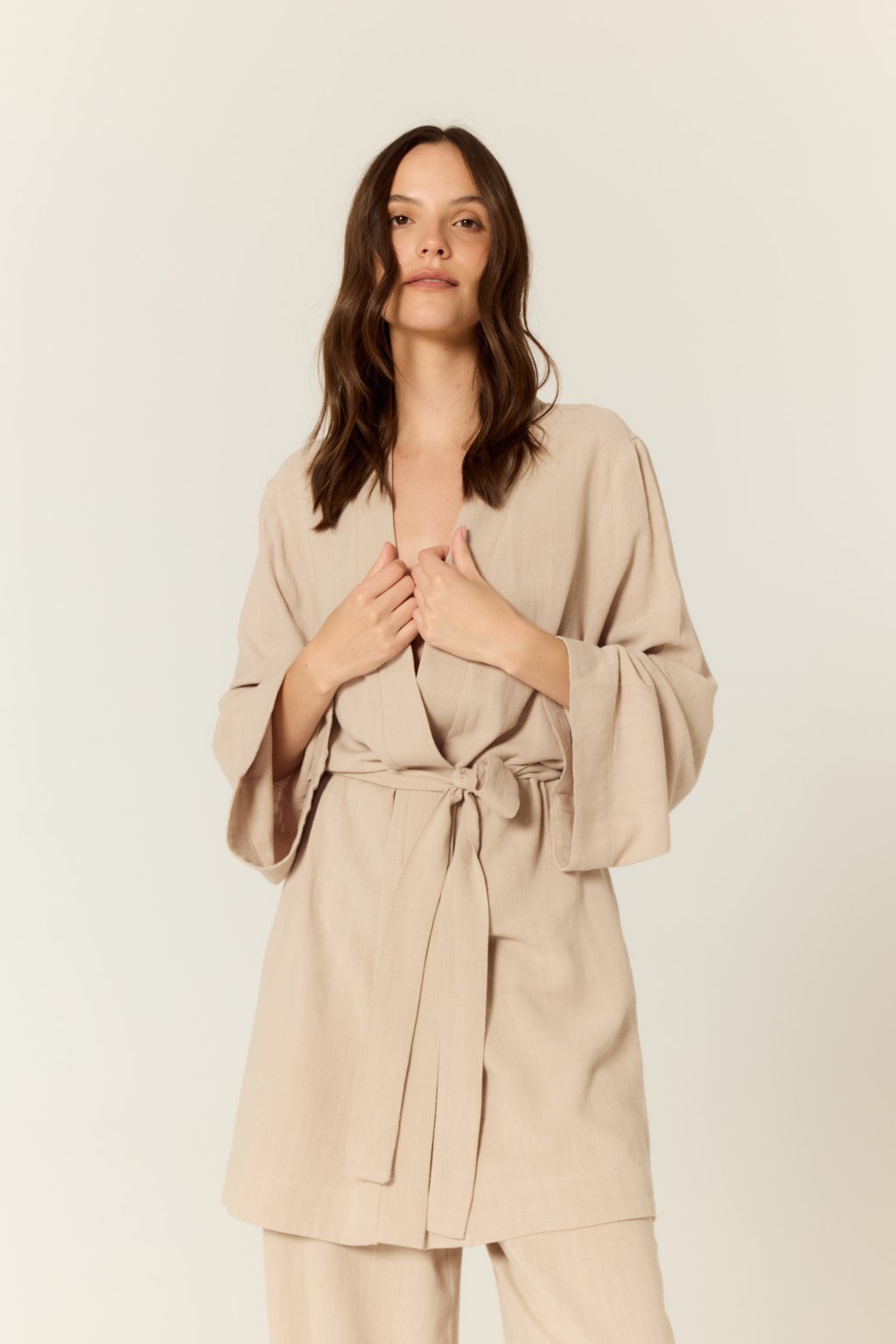 Dłuższa wersja kimona, którą możesz nosić jako sukienkę lub narzutkę. Wiązanie zapewnia stabilność, a lejący materiał z wiskozy i lnu przyjemnie układa się na sylwetce. Świetnie wygląda z spodniami z tej samej kolekcji.