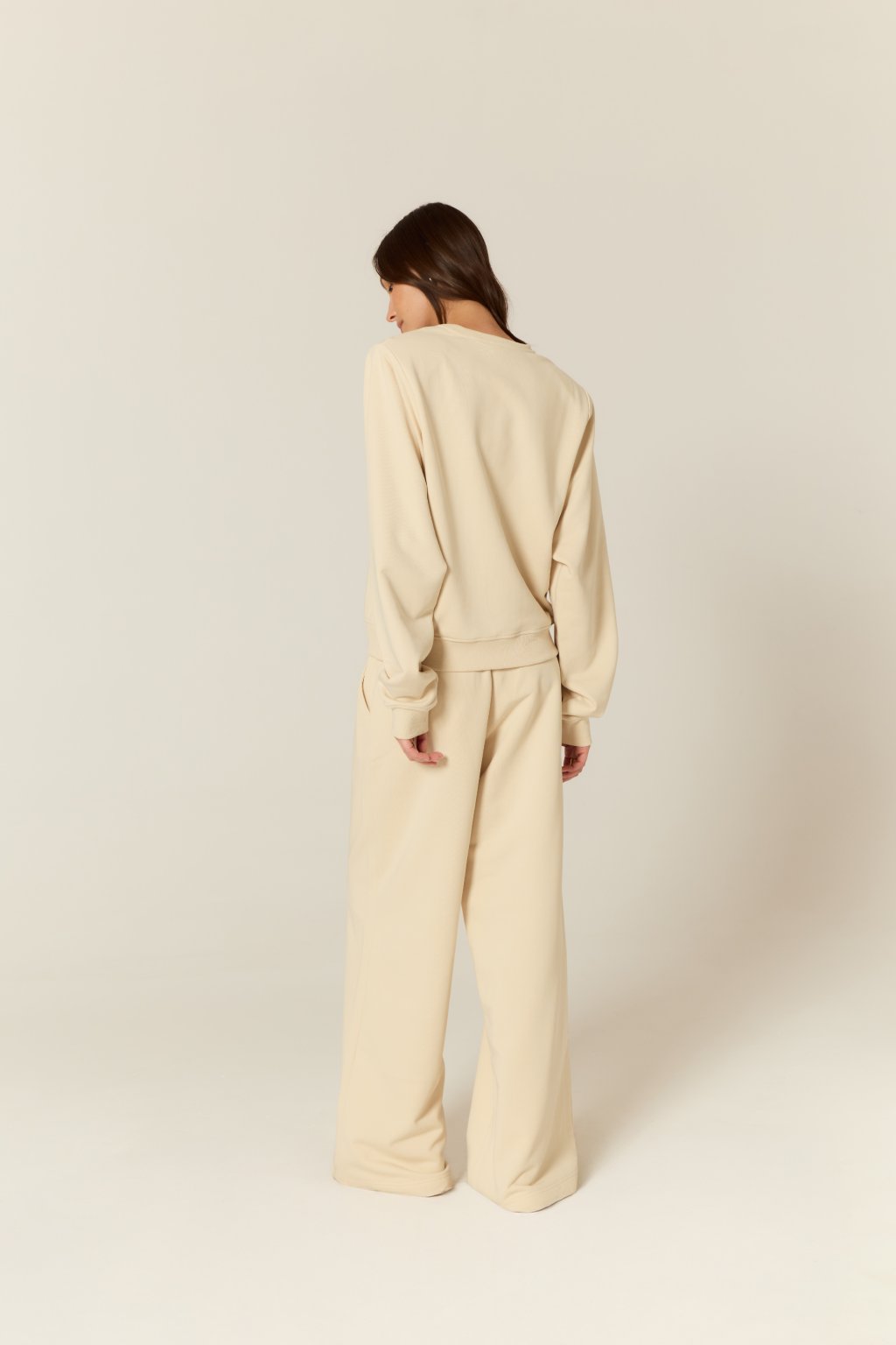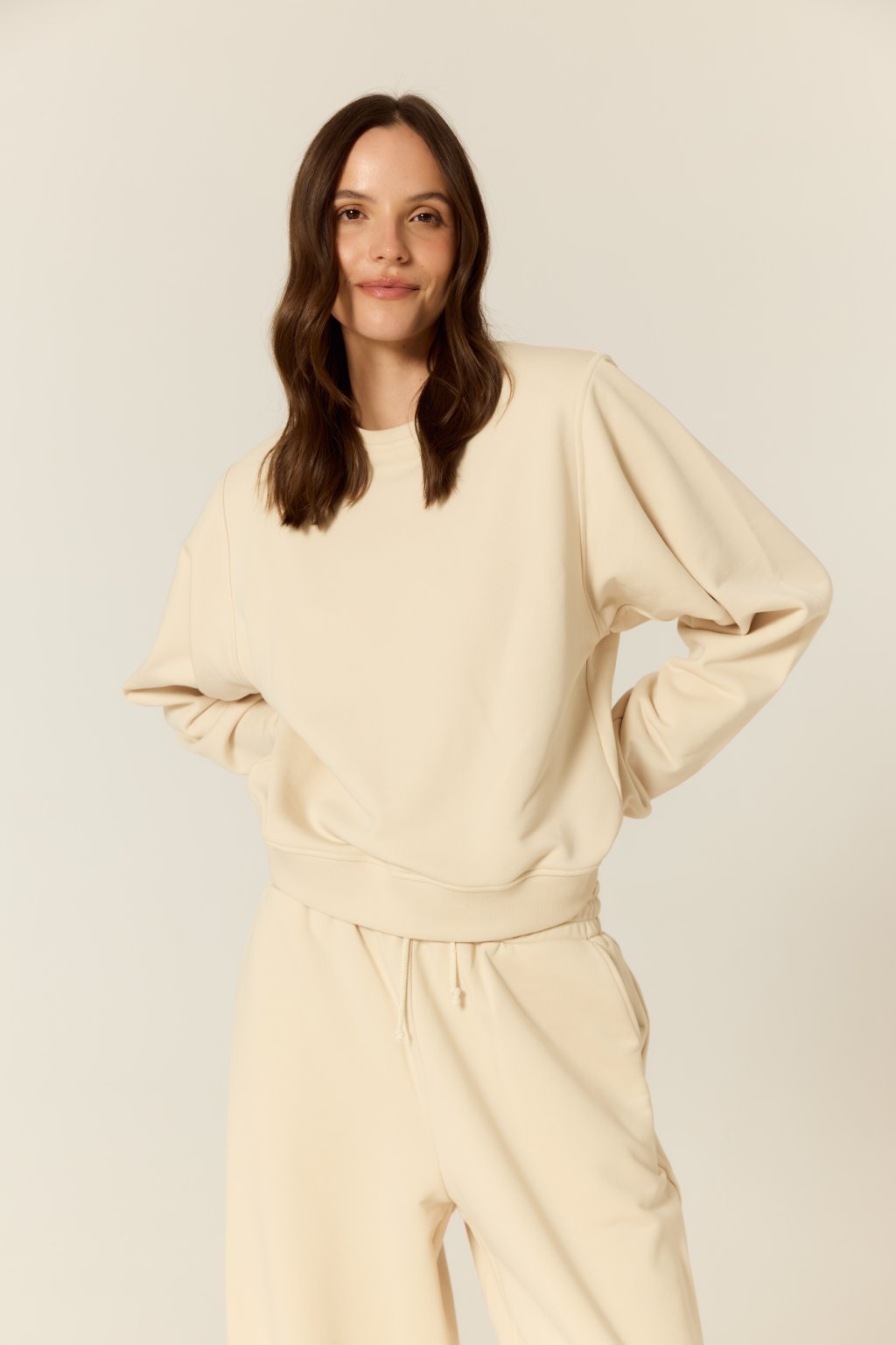 Bluza z dzianiny dresowej z kolekcji Buttery Yellow to ukłon w stronę minimalizmu z charakterem. Uszyta z tej samej, wysokogatunkowej pętelkowej dzianiny co pozostałe elementy zestawu (top i spodnie), łączy komfort, trwałość i szlachetny wygląd.