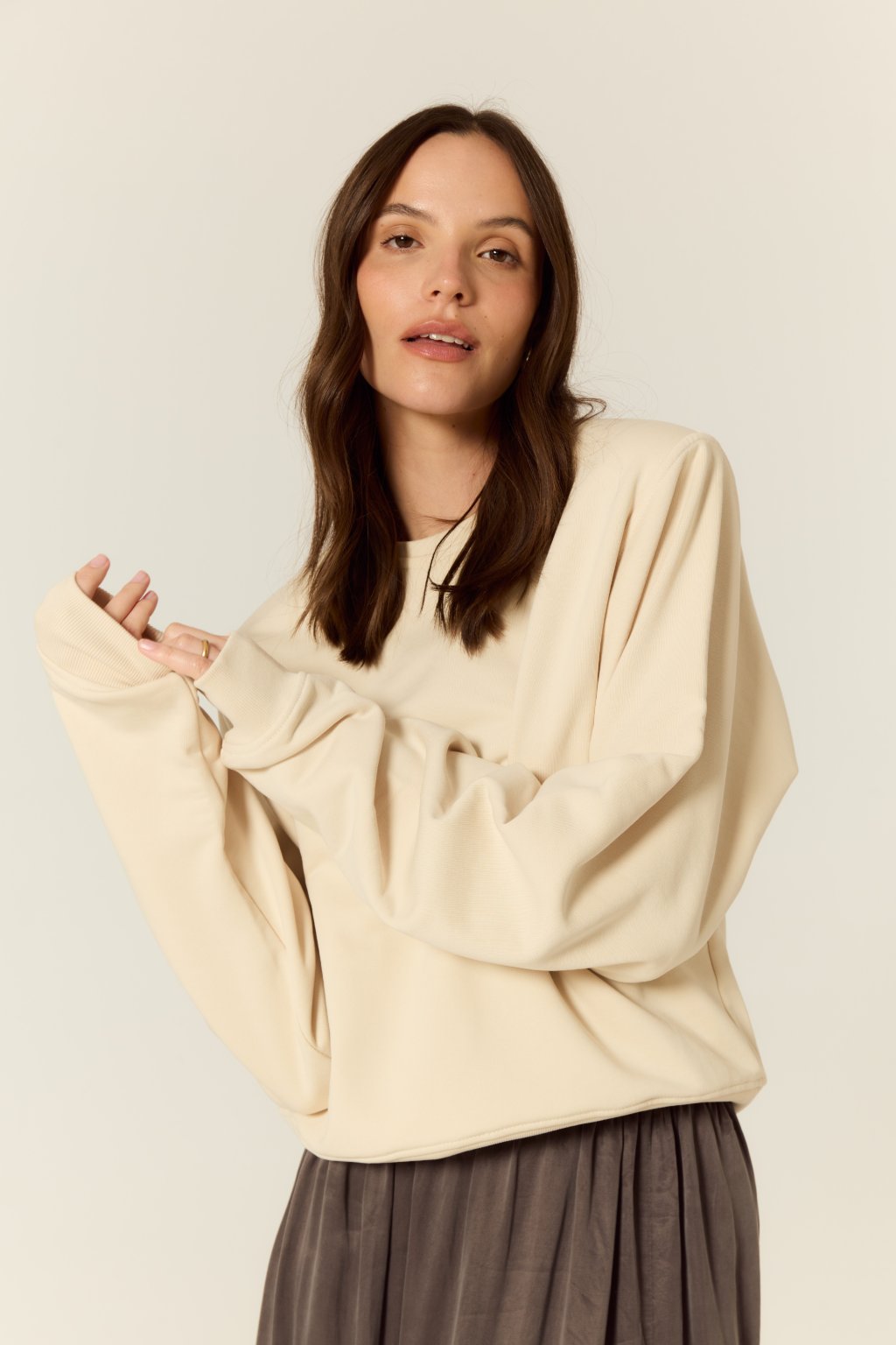 Miękka, casualowa bluza o lekko oversize’owym kroju, uszyta z tej samej dzianiny co nasz top i spodnie z kolekcji Butter Yellow. Wyposażona w subtelne, odpinane poduszki ramienne i wykończona taśmą rypsową w dekolcie. Komfortowa i stylowa – idealna do eleganckich oraz sportowych stylizacji.
