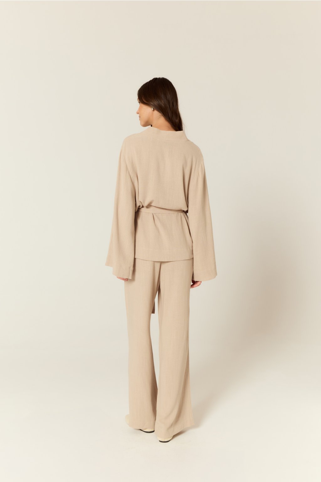 Lekki top w japońskim stylu z naturalnej mieszanki wiskozy i lnu. Wiązanie w pasie, stabilny krój, idealny do naszych spodni lub jako narzutka na bieliznę.