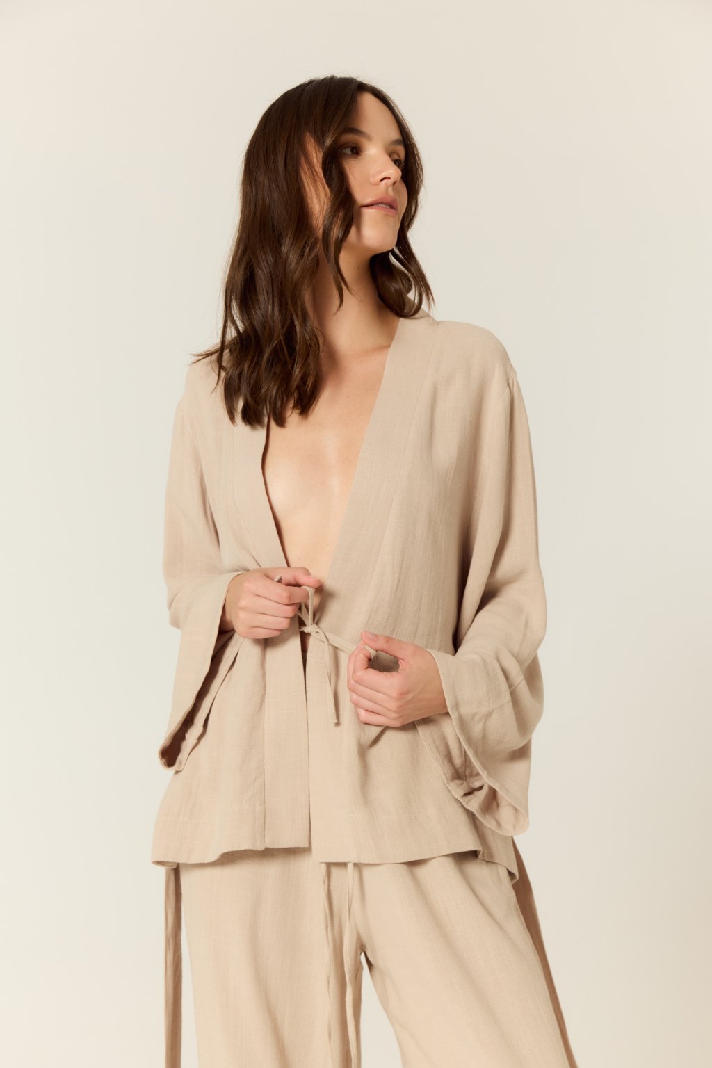Ten krótki wiązany top kimono świetnie łączy się z naszymi szerokimi spodniami z tego samego materiału. Aby stworzyć spójny outfit, możesz uzupełnić top o nasz długi kimono prześwit w tym samym odcieniu, który można nosić samodzielnie jako sukienkę lub warstwowo jako letnią narzutkę. Wszystkie trzy elementy – spodnie, krótki top kimono i długi kimono – idealnie do siebie pasują zarówno pod względem koloru, jak i stylu, umożliwiając swobodną stylizację według nastroju, okazji i osobistych upodobań.
