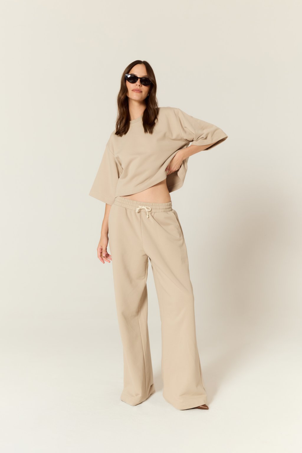 Klasyczny, oversize top z miękkiej, szlachetnej dzianiny dresowej z 90% bawełny i 10% poliestru, który zapewnia trwałość i zachowanie kształtu. Wykończony taśmą rypsową przy dekolcie. Idealny do kompletów z szerokimi spodniami i bluzą. Dostępny w kolorze masłowo-żółtym (Butter Yellow) i Taupe.