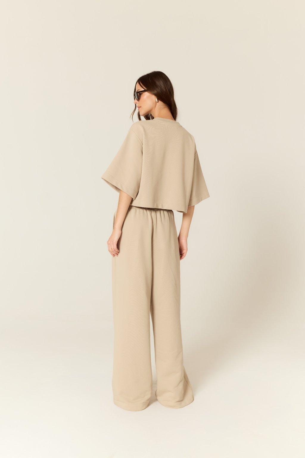 Top świetnie komponuje się z pozostałymi elementami z tej samej dzianiny — szerokimi spodniami dresowymi oraz bluzą z odpinanymi poduszkami na ramionach, tworząc stylowy, spójny komplet casualowy o wysokim standardzie jakości. Dostępny w modnym, intensywnym kolorze masłowo-żółtym (Butter Yellow) oraz ponadczasowym taupe.