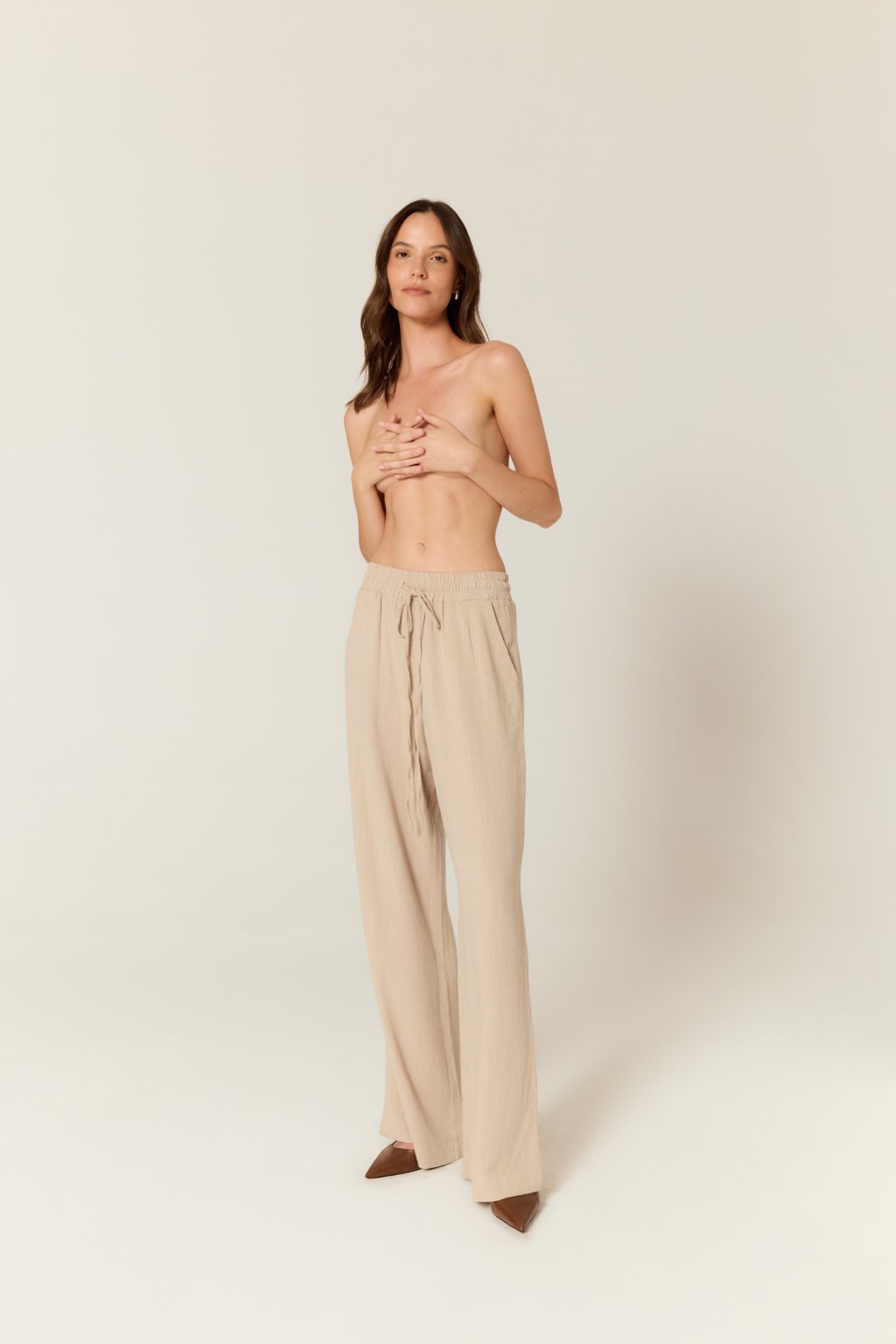 Lekkie letnie spodnie z wiskozy i lnu, z szerokimi nogawkami i wysokim stanem. Stylowa baza na co dzień – idealne do wiązanych topów kimono lub noszone warstwowo z narzutką, którą można założyć także jako sukienkę.