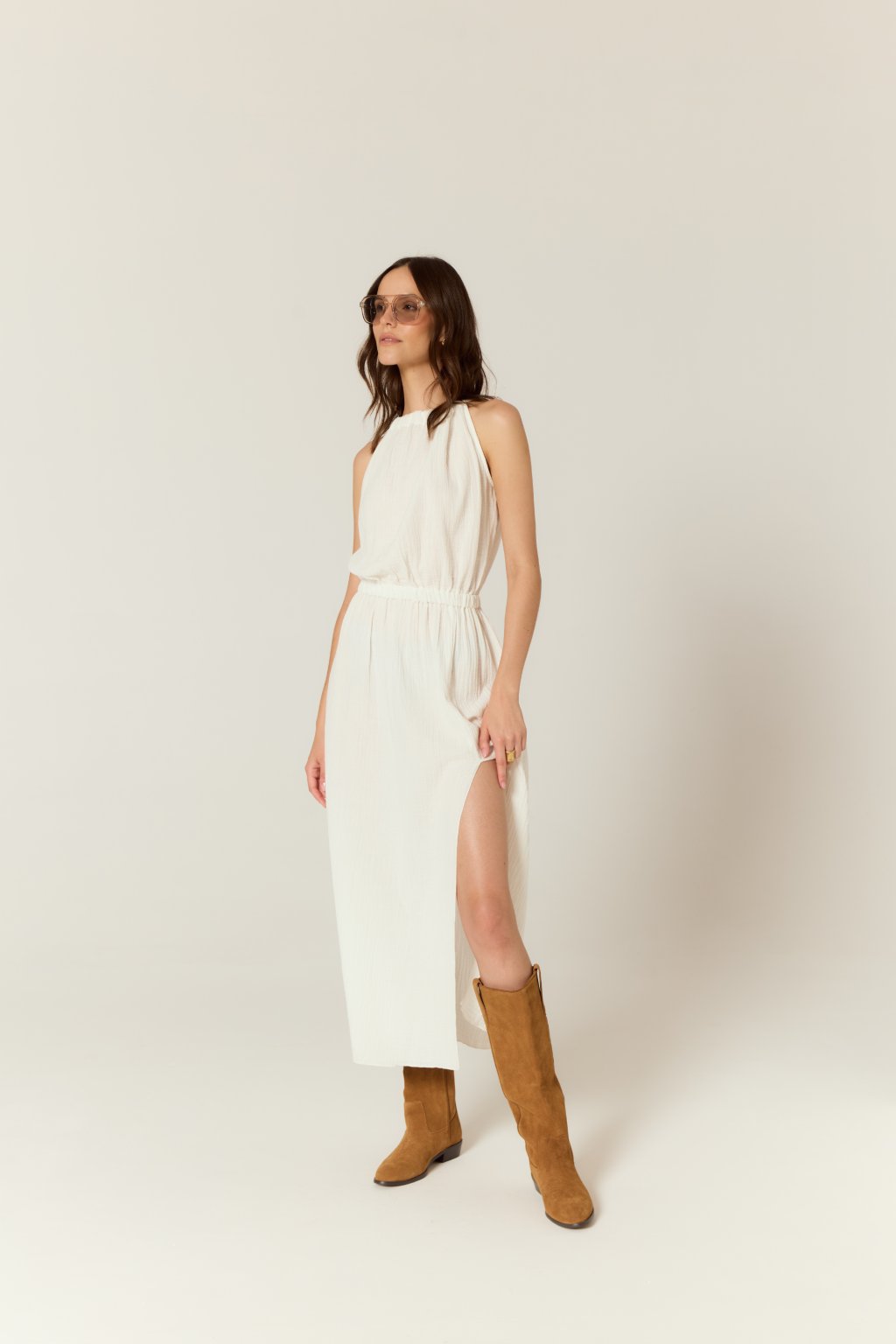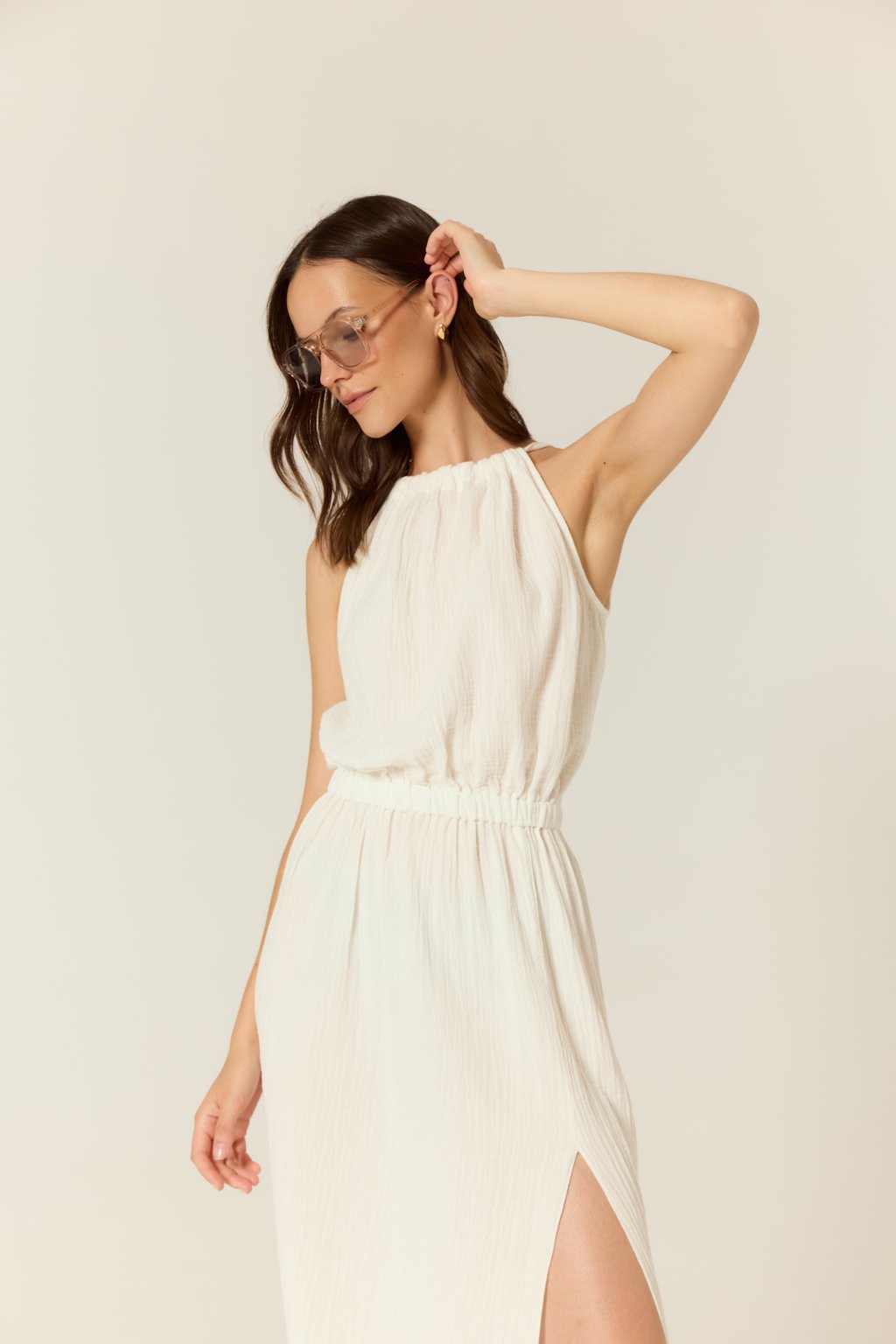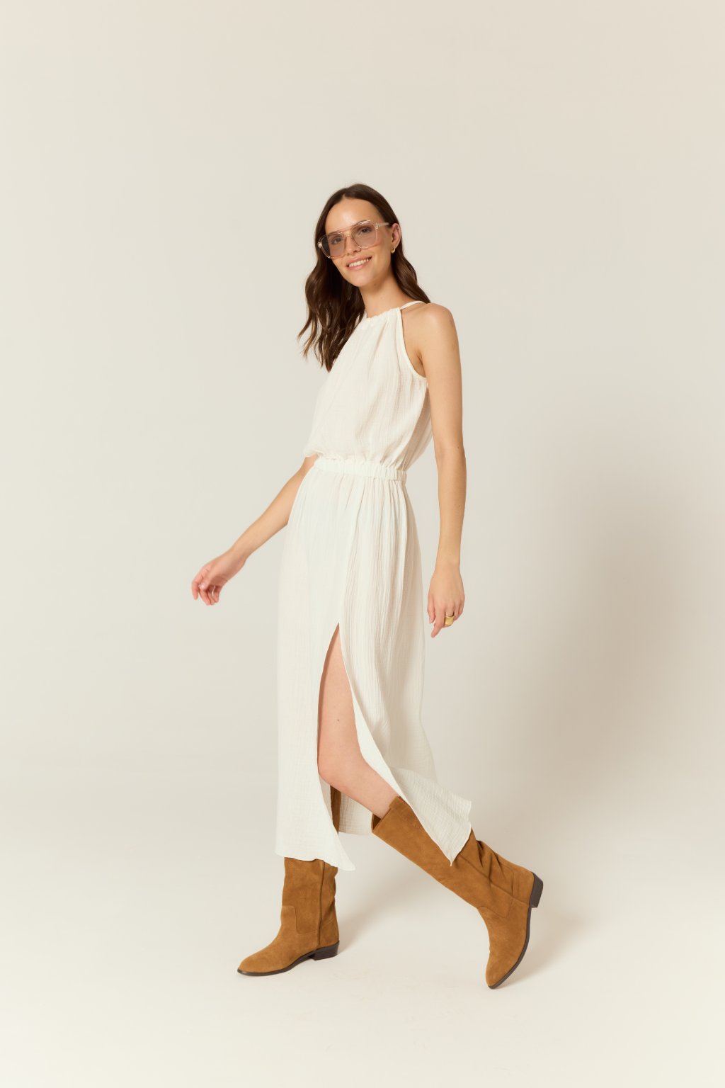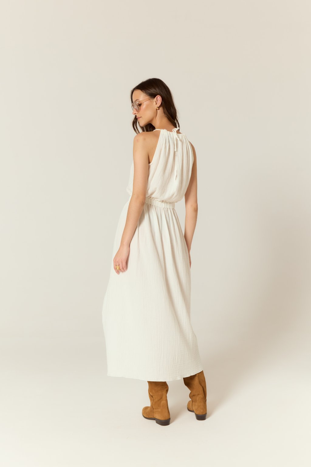 Czas na odkrycie swojej kobiecości w naszej wyjątkowej sukience Maxi! Wykonana z delikatnej 100% bawełny typu muślin, ta sukienka to połączenie wyrafinowanego designu i niezrównanego komfortu.